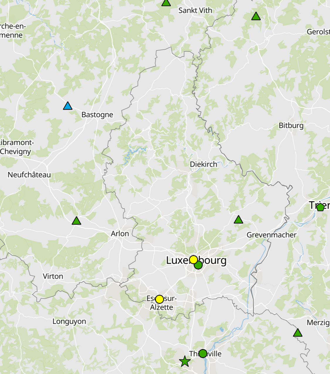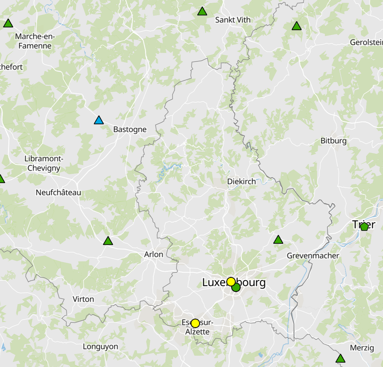 - European air quality index (based on pollutant concentrations in µg/m3): hourly measurements for the pollutant NO2 for the most recent hour for each station - The sub-index NO2 is available according to the type of station (industrial, background or traffic) in accordance with the methodology for calculating the European air quality index for the measuring stations throughout the Greater Region. - Data depth: The most recent index for the last 3 hours for each station is available hourly. If the calculation of the sub-index is not possible due to lack of data, its value is marked by a grey dot in the symbology of the map (data not available). - Data sources: ATMO Grand Est; Agence Wallonne de l'Air et du Climat - AWAC; Landesamt für Umwelt- und Arbeitsschutz Saarland - IMMESA; Landesamt für Umwelt Rheinland-Pfalz - ZIMEN; Administration de l'environnement Luxembourg. Harmonization: ATMO Grand Est and GIS-GR 2020