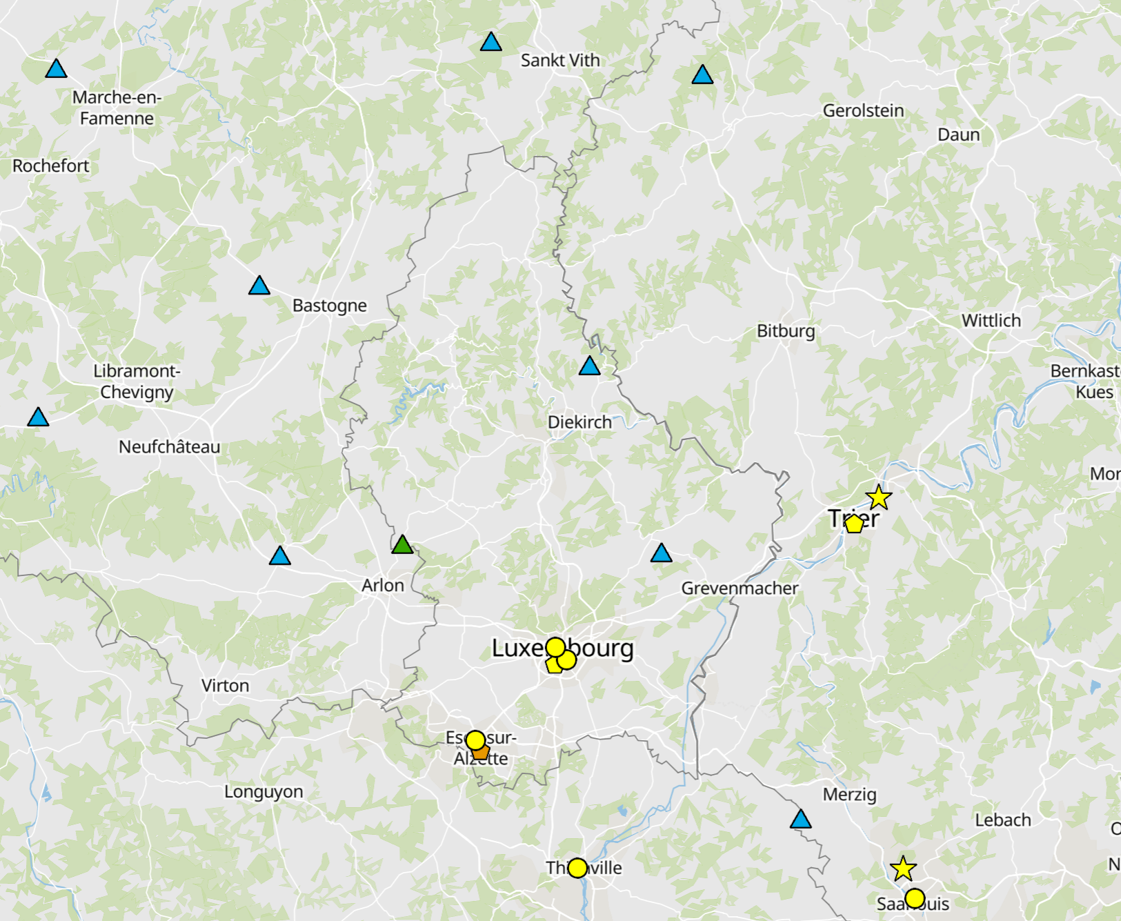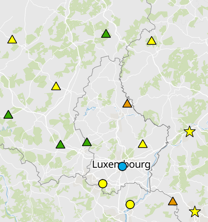 - European air quality index (based on pollutant concentrations in µg/m3): hourly measurements for the pollutant O3 for the most recent hour for each station - The sub-index O3 is available according to the type of station (industrial, background or traffic) in accordance with the methodology for calculating the European air quality index for the measuring stations throughout the Greater Region. - Data depth: The most recent index for the last 3 hours for each station is available hourly. If the calculation of the sub-index is not possible due to lack of data, its value is marked by a grey dot in the symbology of the map (data not available). - Data sources: ATMO Grand Est; Agence Wallonne de l'Air et du Climat - AWAC; Landesamt für Umwelt- und Arbeitsschutz Saarland - IMMESA; Landesamt für Umwelt Rheinland-Pfalz - ZIMEN; Administration de l'environnement Luxembourg. Harmonization: ATMO Grand Est and GIS-GR 2020