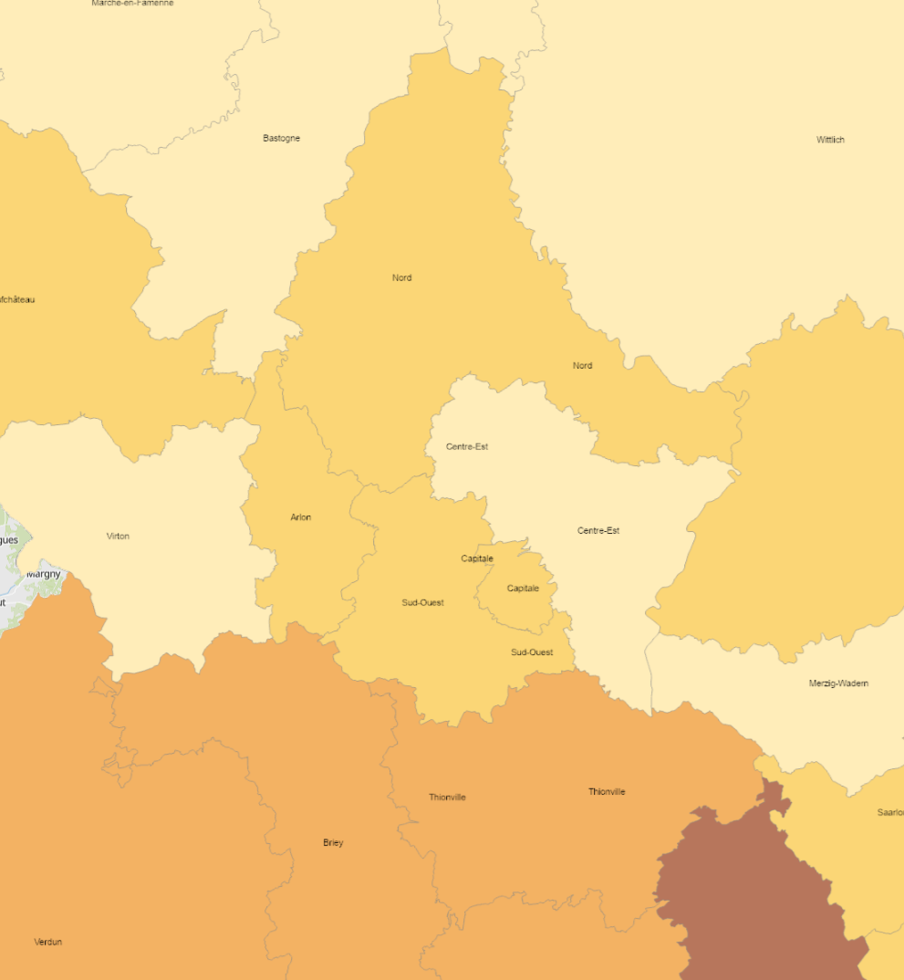Share of road traffic accidents involving injury with children (aged 0-14 years) 2018-2022 - Source: Sub-Working Group on Road Safety of the Summit of the Greater Region 2023 - Base map: © ACT Luxembourg 2017, IGN France 2017, GeoBasis-DE / BKG 2017, NGI-Belgium 2017