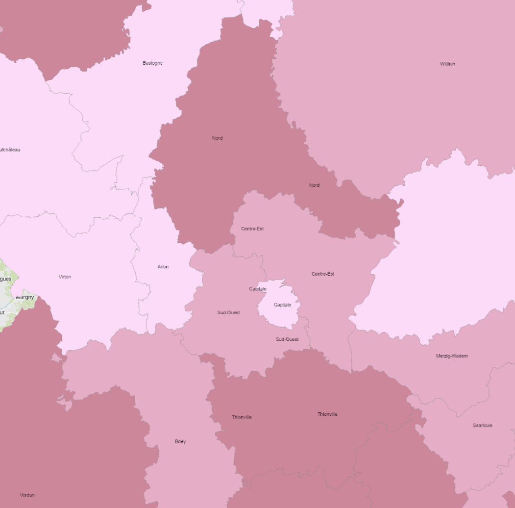 Share of road traffic accidents involving injury with motorized two-wheel vehicles (2015-2019) - Source: Sub-Working Group on Road Safety of the Summit of the Greater Region 2020 - Base map: © ACT Luxembourg 2017, IGN France 2017, GeoBasis-DE / BKG 2017, NGI-Belgium 2017