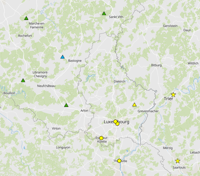- European air quality index (based on pollutant concentrations in µg/m3): hourly measurements for the pollutant PM2.5 for the most recent hour for each station - The sub-index PM2.5 is available according to the type of station (industrial, background or traffic) in accordance with the methodology for calculating the European air quality index for the measuring stations throughout the Greater Region. - Data depth: The most recent index for the last 3 hours for each station is available hourly. If the calculation of the sub-index is not possible due to lack of data, its value is marked by a grey dot in the symbology of the map (data not available). - Data sources: ATMO Grand Est; Agence Wallonne de l'Air et du Climat - AWAC; Landesamt für Umwelt- und Arbeitsschutz Saarland - IMMESA; Landesamt für Umwelt Rheinland-Pfalz - ZIMEN; Administration de l'environnement Luxembourg. Harmonization: ATMO Grand Est and GIS-GR 2020