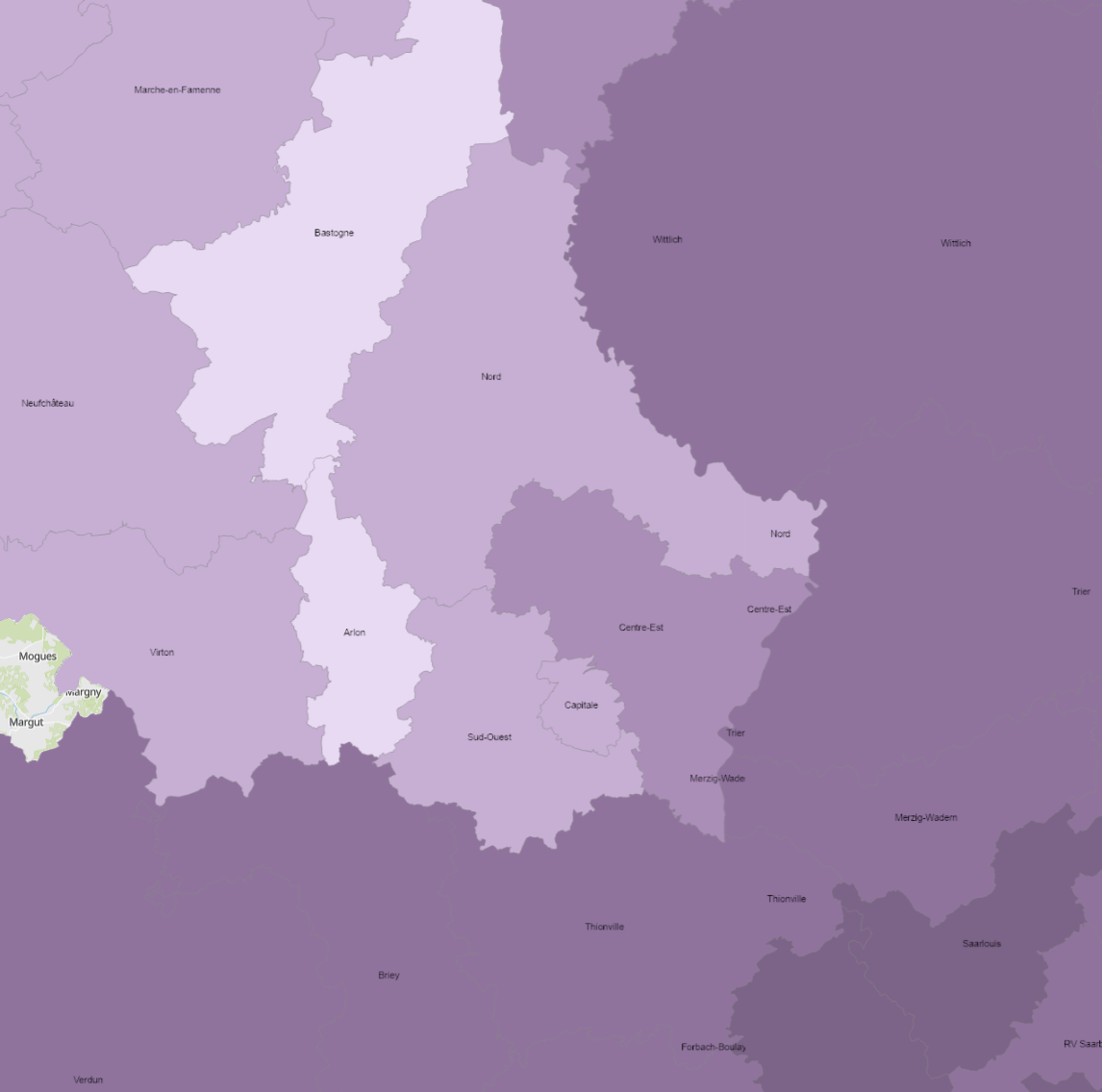 Share of road traffic accidents involving injury with young car drivers (aged 18-24 years) 2015-2019 - Source: Sub-Working Group on Road Safety of the Summit of the Greater Region 2020 - Base map: © ACT Luxembourg 2017, IGN France 2017, GeoBasis-DE / BKG 2017, NGI-Belgium 2017